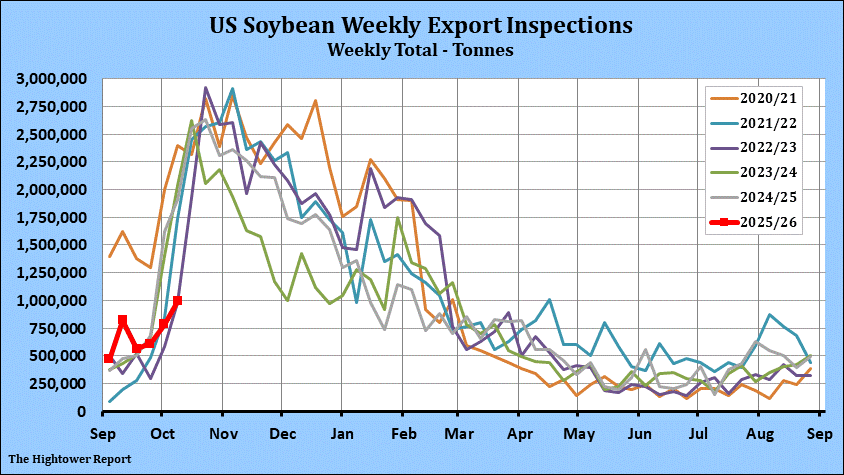 Soybean export inspections for the week ending October 9 came in at 994,008 metric tonnes. Cumulative inspections year-to-date are 4,040,284 metric tonnes which is 26.0% below last year. This is 8.8% of the USDA's forecast for the 2025-26 marketing year versus the five year average of 9.5%.
