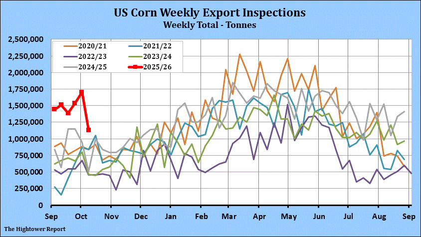 Corn export inspections for the week ending October 9 came in at 1,129,708 metric tonnes. Cumulative inspections year-to-date are 7,940,145 metric tonnes which is 65.0% above last year. This is 10.5% of the USDA's forecast for the 2025-26 marketing year versus the five year average of 6.0%.