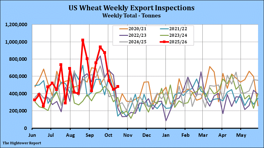 Wheat export inspections for the week ending October 16 came in at 480,614 metric tonnes. Cumulative inspections year-to-date are 11,192,553 metric tonnes which is 20.4% above last year. This is 45.7% of the USDA's forecast for the 2025-26 marketing year versus the five year average of 40.8%.