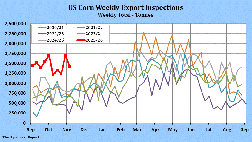 Corn export inspections for the week ending November 6 came in at 1,424,968 metric tonnes. Cumulative inspections year-to-date are 13,725,293 metric tonnes which is 65.7% above last year. This is 18.2% of the USDA's forecast for the 2025-26 marketing year versus the five year average of 10.4%.