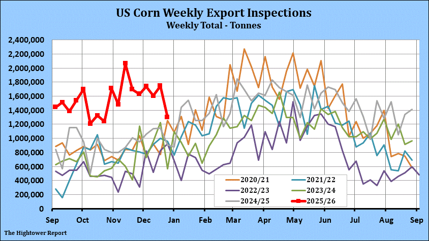 Corn export inspections for the week ending December 25 came in at 1,301,211 metric tonnes. Cumulative inspections year-to-date are 25,571,609 metric tonnes which is 66.2% above last year. This is 32.7% of the USDA's forecast for the 2025-26 marketing year versus the five year average of 19.9%.