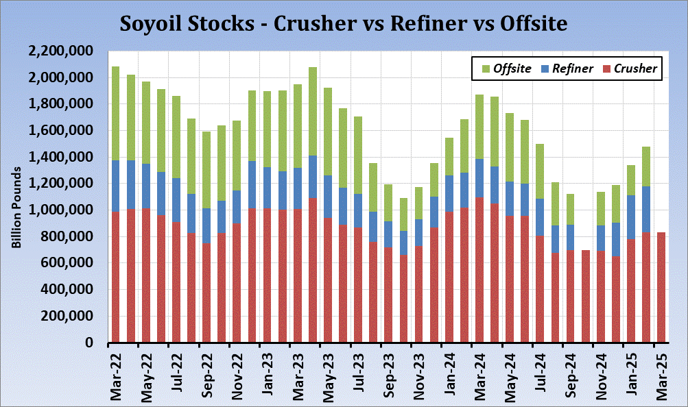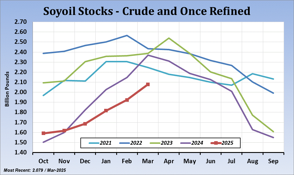 US soybean oil stocks in March came in at 2.079 billion pounds versus 1.924 last month and 2.369 last year. The average stock level for this time of year is 2.332 billion pounds. The largest stock level for this month was 2.434 (2022) and lowest was 2.233 (2019). Current stock levels are running at 0.14% of USDA ending stocks estimates for the year.