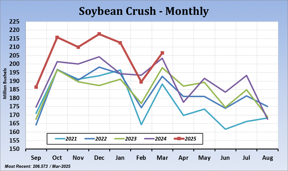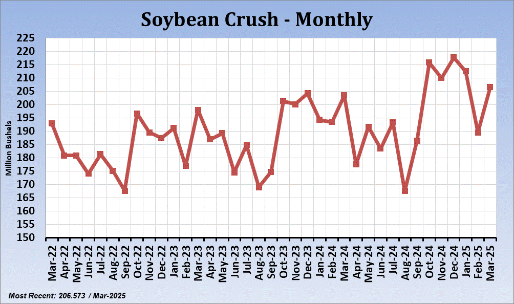 US soybean crush hit a new record high for the month of March at 206.57 million bushels versus the previous record of 203.54 million in 2024. This was within pre-report estimates. The March average is 192.37 million bushels. US soybean crush pace hit a new record high for the month of March at 6.66 million bushels versus the previous record of 6.57 million in 2024. The March average crush pace is 6.21 million bushels per day.