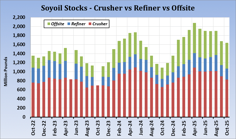 US soybean oil stocks (crude + once refined) in October came in at 1.781 billion pounds versus 1.747 last month and 1.592 last year. The average stock level for this time of year is 1.908 billion pounds. The largest stock level for this month was 2.386 (2021) and lowest was 1.502 (2023).
