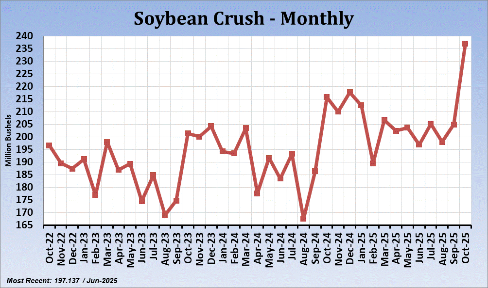 US soybean crush for October hit a new record high at 237.059 million bushels. This was above the high-end of pre-report estimates. The October average is 201.467 million bushels. US soybean crush pace for October hit a new all-time record high at 7.647 million bushels. The October average crush pace is 6.499 million bushels per day.