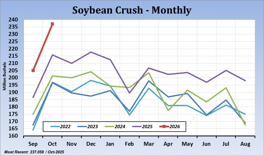 The cumulative crush for the marketing year has reached 442.01 million bushels 17.3% of the USDA's current estimate for the marketing year. As of October last year, the cumulative crush had reached 16.5% of the USDA forecast of 402.29 million bushels.