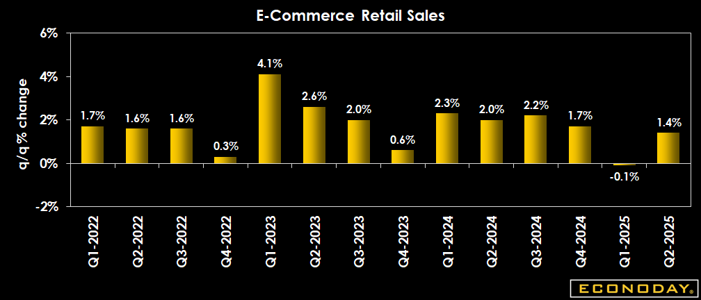 E-commerce sales are up 1.4 percent quarter-over-quarter in the second quarter 2025 after a downward revision to a decline of 0.1 percent in the first quarter. However, the quarterly pace of growth is softer than the moderate pace that characterized 2024 when increases were up 2.3 percent in the first quarter, up 2.0 percent in the second quarter, up 2.2 percent in the third quarter, and up 1.7 percent in the fourth quarter. The second quarter increase for e-commerce sales is faster than the up 0.4 percent for total retail.