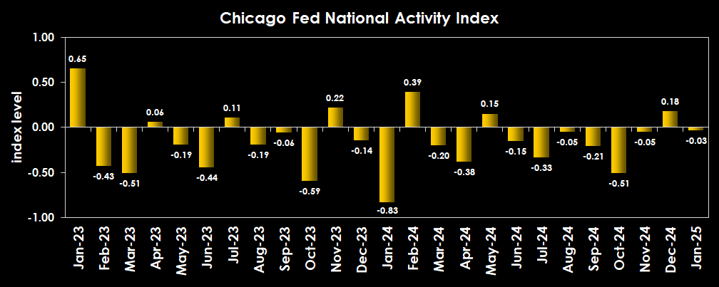 The Chicago Fed national activity index (CFNAI) is down to minus 0.03 in January after positive 0.18 in December. The January reading is below the consensus of 0.00 (zero) in the Econoday survey of forecasters. The four broad categories of indicators that make up the index show 2 positive and 2 negative contributions in January. Among the categories 1 increased and 3 decreased.