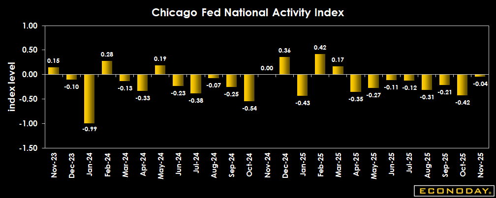 The CFNAI is up to minus 0.04 in November after minus 0.42 in October. The four broad categories of indicators that make up the index show 1 positive and 3 negative contributions in November. Among the categories 3 increased and 1 was unchanged.