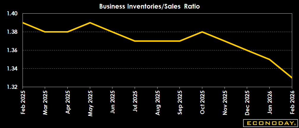 Inventories up more than expected 0.4 percent in February from January versus the 0.2 percent Econoday consensus forecast. Inventories for January revised to show 0.0 percent from the 0.1 percent decline previously reported. Inventories are up 1.3 percent from a year ago.