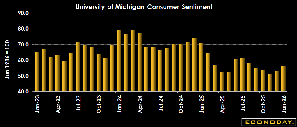 Consumer sentiment perked up in the latter part of January with the University of Michigan index up to 56.4, well above the 54.0 preliminary figure and up 6.6 percent from 52.9 in December, though the index is still down 21 percent from 71.7 in January 2025. The Econoday consensus looked for no revision in the January final report from the January preliminary index at 54.0.