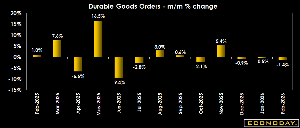 The February advance durables goods data, delayed by the federal government shutdown, shows a big fall in transportation equipment demand dragged new orders down by more than expected, while core business spending excluding defense and aircraft bounced back. It remains to be seen to what extent the Iran war will warp the data in March.