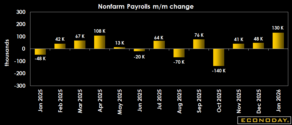 The U.S. economy added 130,000 jobs in January, beating expectations for +70,000 in the Econoday survey of forecasters. The unemployment rate ticked down to 4.3 percent, below expectations for 4.4 percent.
