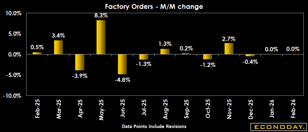 Factory orders are flat in February from January compared with the Econoday consensus calling for a gain of 0.4 percent but as usual these numbers are skewed down by volatile aircraft orders. Orders for January were revised down to show no change from the 0.1 percent uptick initially reported. December is also down by 0.4 percent.