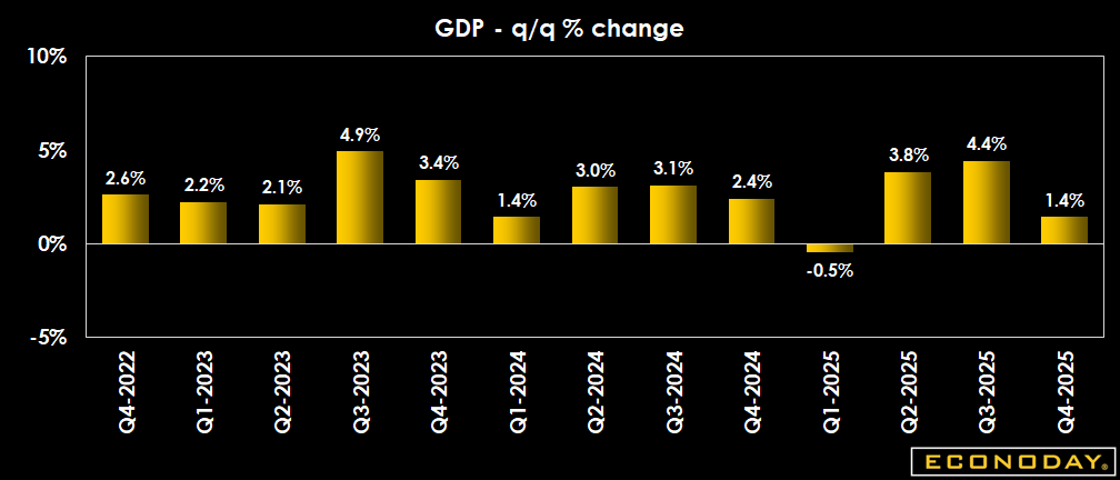 The advance estimate for Q4 GDP shows it increased by 1.4 percent, losing speed from the 4.4 percent rise in the third quarter and falling short of expectations for a 2.8 percent rise in the Econoday survey of forecasters.