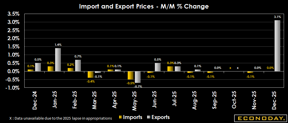 Import prices are up 0.1 percent on the month in December while export prices are up 0.3 percent. That compares with increases of 0.1 percent expected for both in the Econoday consensus forecast.