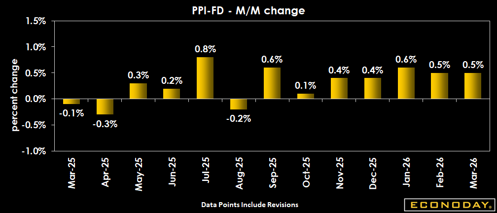 U.S. wholesale price inflation as measured by the Producer Price Index for final demand increased 0.5 percent in March, following an revised 0.5 percent rise (previously +0.7 percent) in February, and nowhere near expectations for a 1.2 percent jump in the Econoday survey of forecasters. Final demand prices were up 0.6 percent in January and saw a 0.4 percent uptick in December.