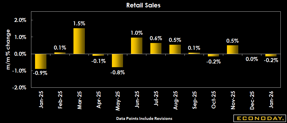 U.S. January retail sales fell 0.2 percent, following the unchanged flat reading reported for December, but better than the -0.4 percent consensus in the Econoday survey of forecasters.