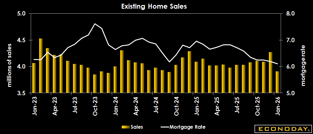 Sales of existing homes are down 8.4 percent in January to 3.91 million units at a seasonally adjusted annual rate compared to 4.27 million units in December. January sales are down 4.4 percent compared to a year ago. The January consensus for home resales is 4.20 million units in the Econoday survey of forecasters. The impact of January weather was not well anticipated.