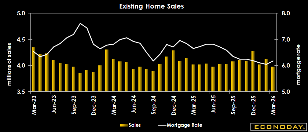 Sales of existing homes in March decline due to a confluence of factors. Consumer confidence is low and concerns about job security are widespread, and inventories of the more sought-after units are limited. While mortgage rates remain favorable for loans taken out in February the Freddie Mac average rate for a 30-year fixed rate mortgage is up from 6.05 percent in February to 6.18 percent in March. This is below 6.65 percent in March 2025. Hopes for a decline in mortgage rates in April are unlikely to be fulfilled and the situation in the economy is not likely to look any better to consumers.