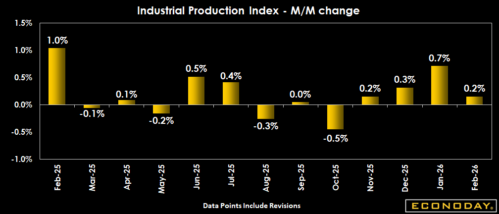 Slow down in the growth of U.S February industrial production, but combined with revised stronger output in January makes for a strong start to 2026. The capability utilization rate was unchanged, and remains below the long-term average, following a slight upward revision in the prior month.