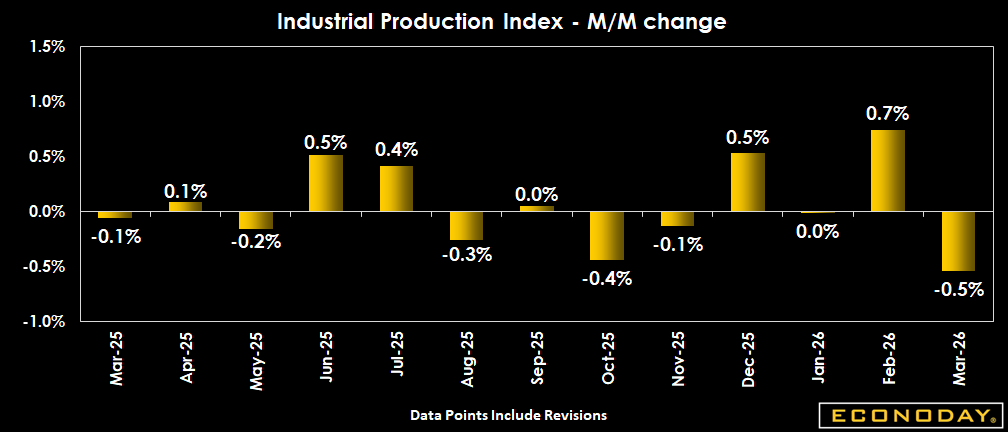 Manufacturing production is down 0.1 percent in March after rising 0.4 percent in February. The increase is below the consensus of up 0.3 percent in the survey. Durables manufacturing is down 0.2 percent in March. The decline is led by a 3.7 percent decrease in motor vehicles and parts. Manufacturing excluding motor vehicles is up 0.1 percent. Nondurables manufacturing is down 0.1 percent including a 0.3 percent decrease in food, beverage, and tobacco products.