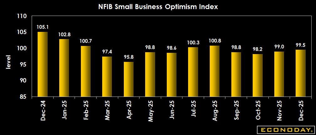 The NFIB small business optimism index remains in a narrow range around the 52-year average of 98 for the eighth month in a row. The December index is up 0.5 point to 99.5 and is a near match to the consensus of 99.4 in the Econoday survey of forecasters. However, the NFIB survey was taken in December and does not reflect current geopolitical events and the subpoena the Trump Department of Justice sent to the Federal Reserve regarding the cost of renovations to the Fed headquarters in Washington, DC.