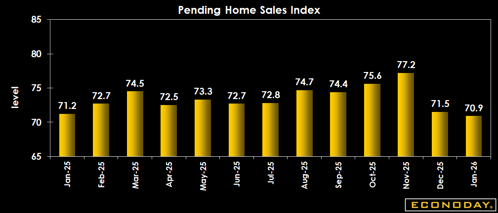 The NAR's pending home sales index for January dips 0.8 percent to 70.9 after 71.5 in December and is below 71.2 in January 2025. The decrease is well below the Econoday survey of forecasters consensus of an increase of 2.5 percent in January. The report includes annual revisions.