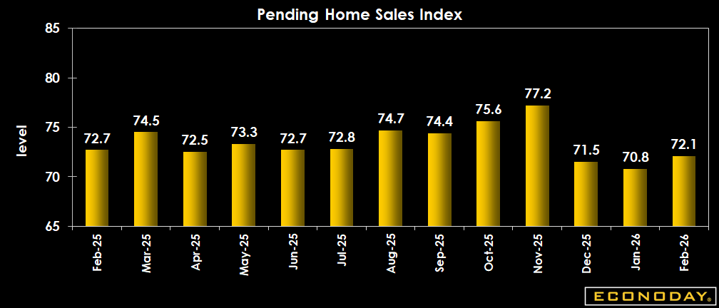 The NAR's pending home sales index for February rises 1.8 percent to 72.1 after a negligible downward revision to 70.8 in January. The index is 0.8 percent than a year ago. The February reading is above the consensus of down 1.0 percent in the Econoday survey of forecasters. The February increase is likely due to further declines in mortgage rates, and some rebound after severe winter storms kept homebuyers out of the market in January. Across regions, the pending home sales index is down 3.6 percent in the Northeast, up 4.6 percent in the Midwest, up 2.7 percent in the South, and up 0.9 percent in the West.