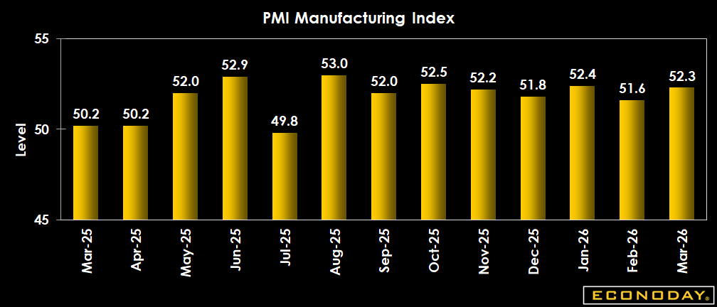 The final S&P PMI index comes in at 52.3 for March, a tick below the 52.4 expected and 52.4 in the March flash report. The market looks for an eerily similar outcome in the ISM manufacturing report due at 10 am ET with the Econoday consensus forecast at 52.3 for March versus 52.4 in February.