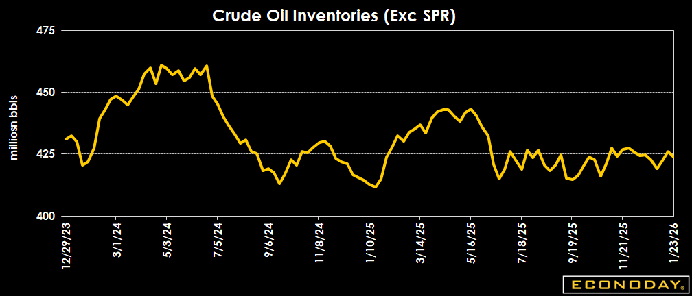 Crude oil inventories are down by 2.3 million barrels to 423.8 million barrels in the week ended Jan. 23 from 426.0 million a week earlier. The latest total is about 3 percent below the 5-year average for this time of year, and up 2.1 percent from a year ago.