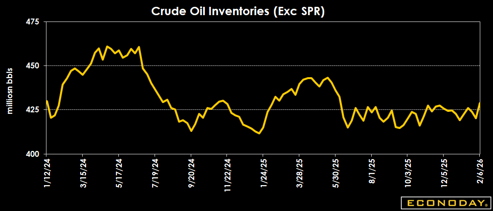 Crude oil inventories are up by a massive 8.5 million barrels to 428.8 million barrels in the week ended Feb. 6 from 420.3 million a week earlier. The latest total is about 3 percent below the 5-year average for this time of year, and up 0.2 percent from a year ago.