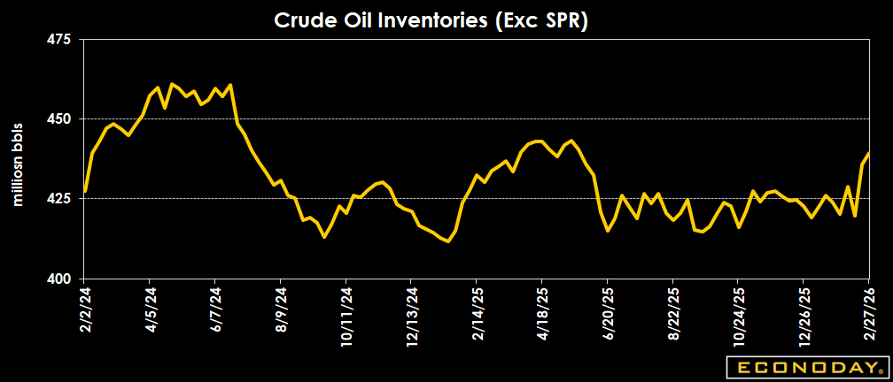 Crude oil inventories are up by a moderate 3.5 million barrels to 439.3 million barrels in the week ended Feb. 27 from 435.8 million a week earlier. The latest total is about 3 percent below the 5-year average for this time of year, and up 1.3 percent from a year ago.