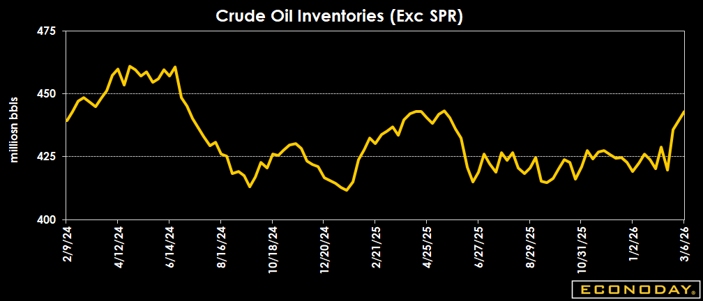 Crude oil inventories are up by a moderate 3.8 million barrels to 443.1 million barrels in the week ended March 6 from 439.3 million a week earlier. The latest total is about 2 percent below the 5-year average for this time of year, and up 1.8 percent from a year ago.