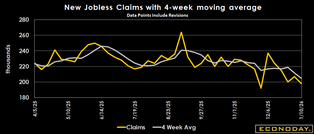 Initial jobless claims came in lower than expected, with the level reported in the week ending January 10 down 9,000 from the revised 207,000 level reported for the prior week (previously 208,000). The January 10 week's level compares to the consensus of 212,000 in the Econoday survey of forecasters. The four-week moving average is down 6,500 to 205,000 in the January 10 week.