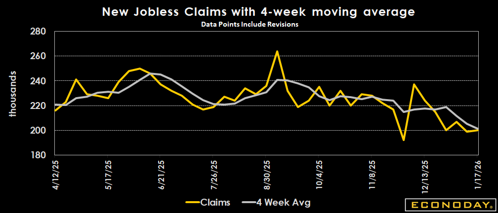 Claims for the latest week come in lower than expected at 200,000 versus the 205,000 figure anticipated in the Econoday consensus. That is up just 1,000 from the previous week's revised 199,000 (versus 198,000 previously reported).