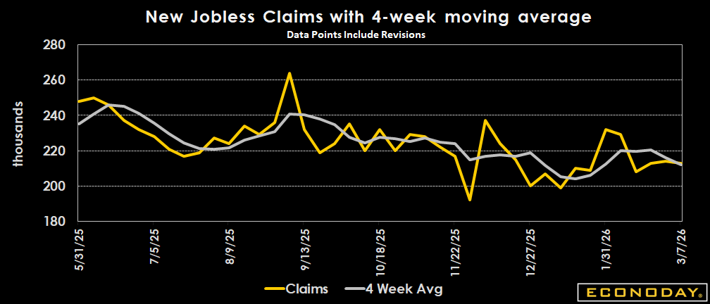A remarkably stable picture emerges from these reports suggesting more of the same low-hire, low-fire job market Federal Reserve officials have been seeing. Of course, the latest week's report does not yet capture any impact on the job market from the unfolding conflagration in the Middle East and surging energy prices. All the data releases up until now are pretty much old news though it depends on the persistence of high and rising energy prices and other unforeseen effects from the Iran situation.