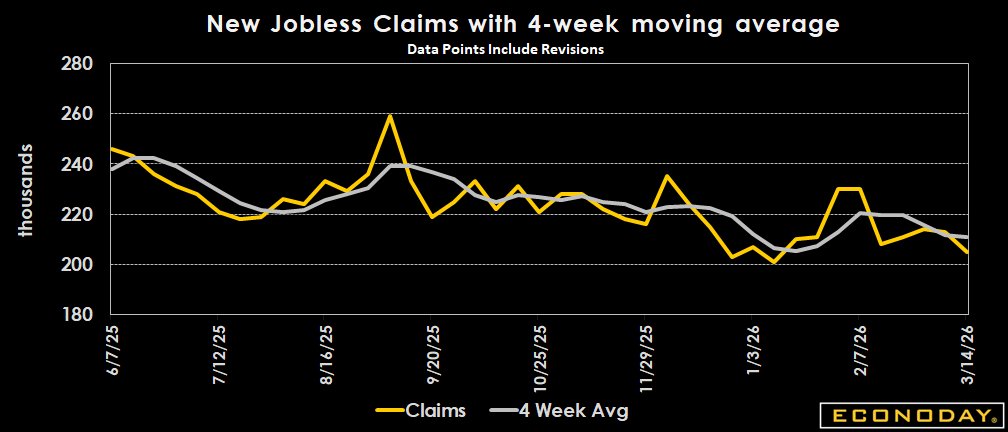 Initial jobless claims came in lower than expected, with the level reported in the week ending March 14 down 8,000 from the unrevised 213,000 level reported for the prior week. The March 14 week's level compares to the consensus of 215,000 in the Econoday survey of forecasters. The four-week moving average dipped 750 to 210,750 in the March 14 week.