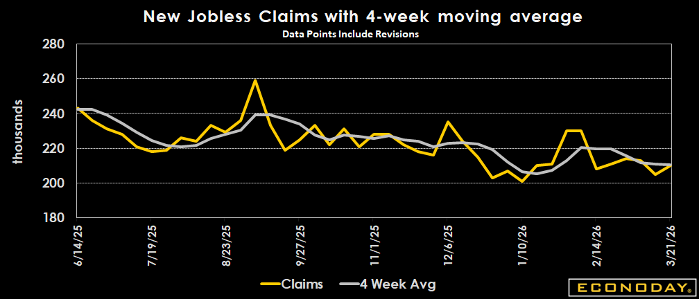 In lagging data for the March 14 week, insured jobless claims dropped 32,000 to 1.819 million, the lowest level since the May 25, 2024 week. The four-week average came down 2,000 to 1.847 million, the lowest level since October 5, 2024. The insured rate of unemployment remained at 1.2 percent, where it has been since late November 2025.