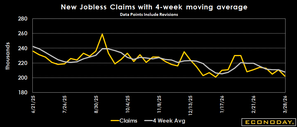 Initial jobless claims are down 9,000 to 202,000 in the week ending March 28. This is below the consensus of 213,000 in the Econoday survey of forecasters. The decrease is slightly exaggerated by seasonal adjustment that anticipated an increase. Unadjusted jobless claims are 184,845, a decline of 1.0 percent from the prior week where the seasonal adjustment is for a 3.7 percent rise in new claims. The last weeks of March and the first weeks of April can be difficult to adjust due to the changing dates of the spring holidays. As a result, the week-to-week moves can be somewhat volatile. The seasonally adjusted four-week moving average is down 3,000 in the March 28 week to 207,750, suggesting that the underlying trend for new claims remains fairly steady in the low 200,000's and consistent with low levels of layoff activity.