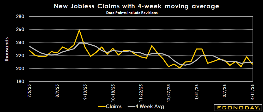 Initial jobless claims came in lower than expected, with the level reported in the week ending April 11 down 207,000 from the revised 218,000 level reported for the prior week (previously 219,000). The April 11 week's level compares to the consensus of 215,000 in the Econoday survey of forecasters. The four-week moving average rose by 500 to 209,750 in the April 11 week.