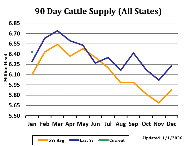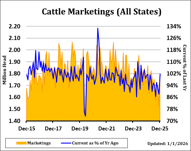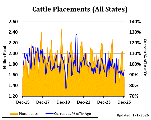 Cattle on Feed supply as of January 1st came in at 96.8% of last year, versus the average trade estimate of 96.8% with a range of 96.0% to 97.6%. Placements for December were 94.6% versus trade expectations of 93.1% and a range of 88.0% to 95.4%. Marketings came in at 101.8% of last year as compared with the average estimate of 101.7% and a range of 100.0% to 102.5%.