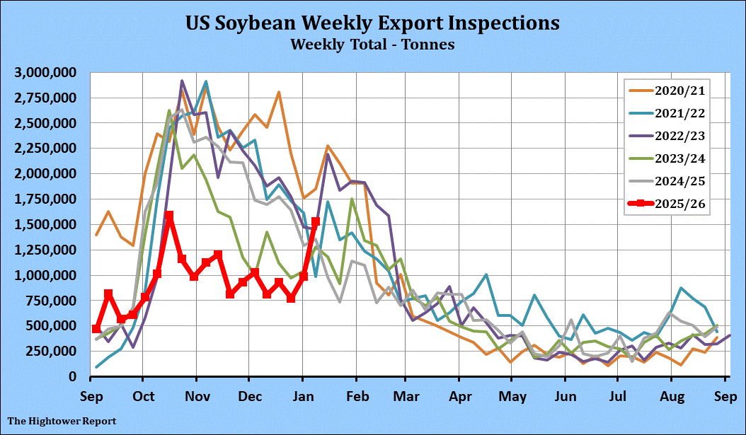 Soybean export inspections for the week ending January 8 came in at 1,529,707 metric tonnes. Cumulative inspections year-to-date are 17,934,546 metric tonnes which is 42.7% below last year. This is 40.3% of the USDA's forecast for the 2025-26 marketing year versus the five year average of 58.5%.