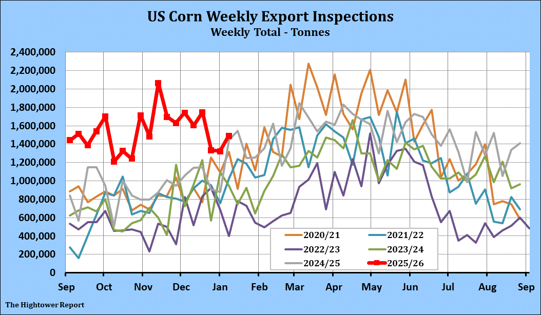 Corn export inspections for the week ending January 8 came in at 1,489,936 metric tonnes. Cumulative inspections year-to-date are 28,426,802 metric tonnes which is 60.5% above last year. This is 36.4% of the USDA's forecast for the 2025-26 marketing year versus the five year average of 23.1%.