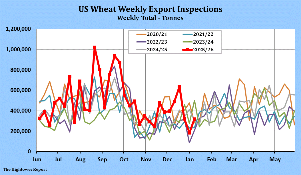 Wheat export inspections for the week ending January 8 came in at 317,465 metric tonnes. Cumulative inspections year-to-date are 15,581,440 metric tonnes which is 19.2% above last year. This is 63.6% of the USDA's forecast for the 2025-26 marketing year versus the five year average of 56.5%.