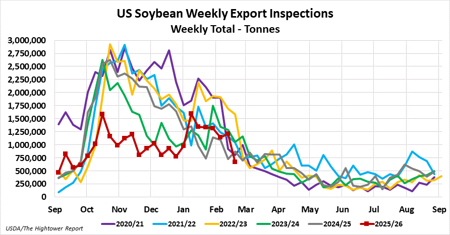 Soybean export inspections for the week ending February 19 came in at 669,865 metric tonnes. Cumulative inspections year-to-date are 25,033,167 metric tonnes which is 32.2% below last year. This is 58.4% of the USDA's forecast for the 2025-26 marketing year versus the five year average of 74.1%.