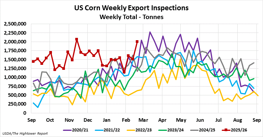 Corn export inspections for the week ending February 19 came in at 2,005,050 metric tonnes. Cumulative inspections year-to-date are 37,744,861 metric tonnes which is 45.6% above last year. This is 46.4% of the USDA's forecast for the 2025-26 marketing year versus the five year average of 33.4%.