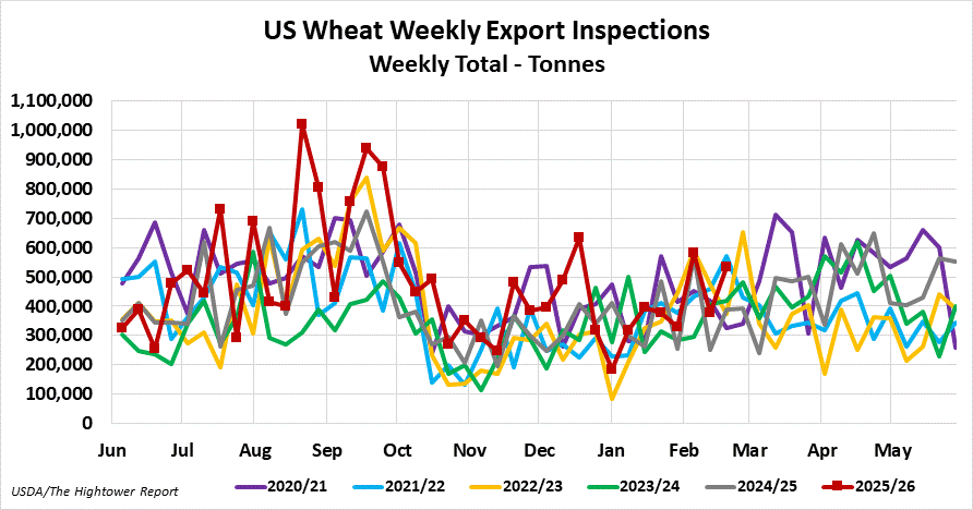 Wheat export inspections for the week ending February 19 came in at 535,113 metric tonnes. Cumulative inspections year-to-date are 18,243,611 metric tonnes which is 19.4% above last year. This is 74.5% of the USDA's forecast for the 2025-26 marketing year versus the five year average of 67.3%.