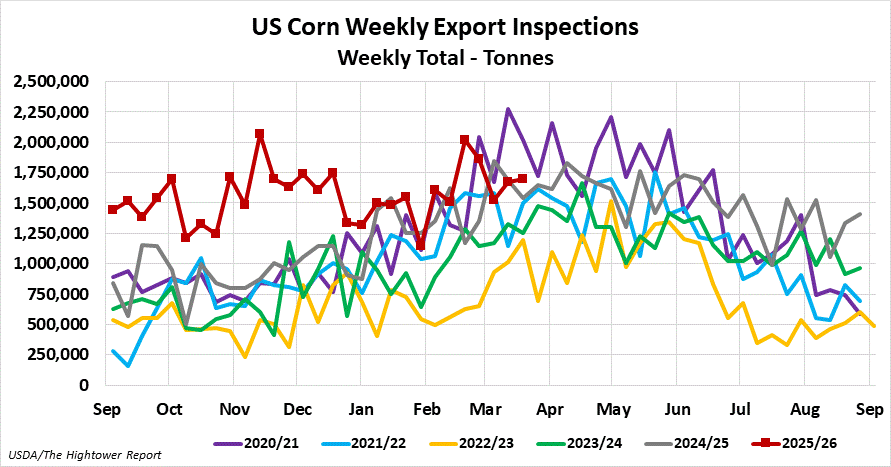 Corn export inspections for the week ending March 19 came in at 1,700,178 metric tonnes. Cumulative inspections year-to-date are 44,580,849 metric tonnes which is 37.8% above last year. This is 54.8% of the USDA's forecast for the 2025-26 marketing year versus the five year average of 42.6%.