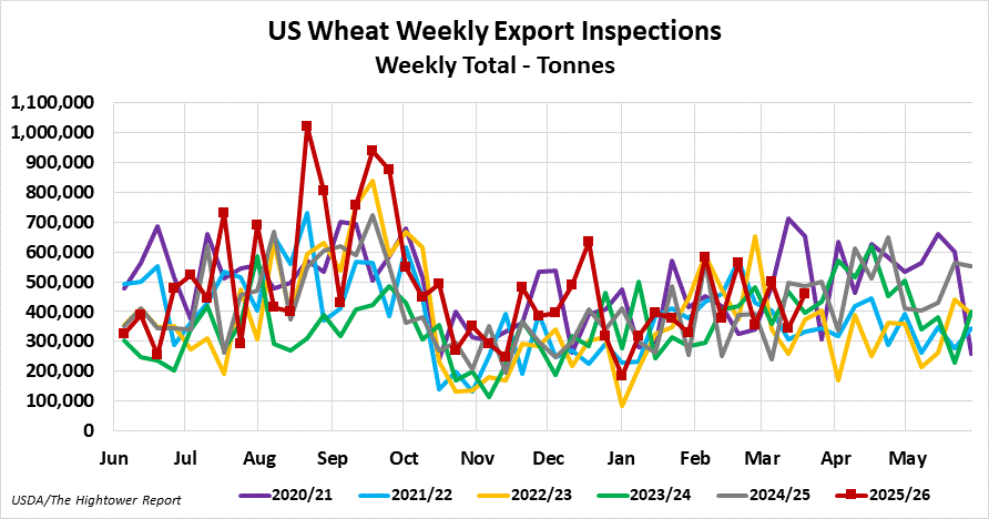 Wheat export inspections for the week ending March 19 came in at 458,411 metric tonnes. Cumulative inspections year-to-date are 19,929,483 metric tonnes which is 18.0% above last year. This is 81.4% of the USDA's forecast for the 2025-26 marketing year versus the five year average of 75.0%.